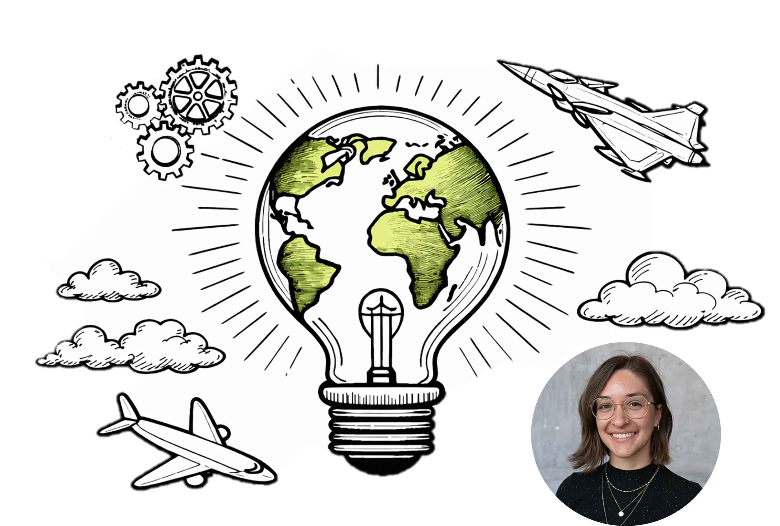 The illustration consists of a light bulb containing the Earth, surroun ded by gears, clouds, airplanes and a circular arrow. It symbolises sustainability, aerospace, engineering and innovation. Image generated by Pauline L´eonard using GPT-5.3, April 2026.